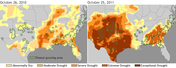 Drought has affected U.S. peanut-growing counties since 2010 (left). By fall 2011 (right), severe and exceptional drought were widespread across peanut-growing areas in Texas and the Southeast. Maps by NOAA Climate.gov team, based on U.S. Drought Monitor data. large photos: October 26, 2010 | October 25, 2011