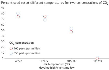 Greenhouse experiments on peanut plants found that rising temperatures (daytime high and nighttime low) decreased peanut seed set—the percent of flowers on a plant that make seeds, regardless of the level of carbon dioxide in the atmosphere. When daytime highs reached 104°F, only half a plant’s flowers made seed. At 111°F, seed set dropped to zero. Graph by climate.gov team, based on data from P.V. Vara Prasad, Kansas State University.