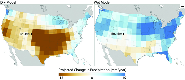 The maps show projected changes in precipitation (millimeters per year) for 2061-2080 relative to model output for 1971-2000. The projections are based on a possible future emissions scenario called A1B that is identified by the Intergovernmental Panel on Climate Change. The map on the left shows the results from the model that projected the driest outcome for Boulder; the map on the right shows results from the model that projected the wettest outcome. (Maps by Ned Gardiner and Hunter Allen. Wet model data from Canadian Climate Model (CCCMA). Dry model data from Geophysical Fluid Dynamics Laboratory Model CM2.0.)