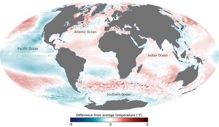 In 2011, La Niña cooled the tropical Pacific Ocean, but warmer-than-usual temperatures continued to dominate the remainder of the global ocean. Outside of the Pacific Ocean, warmer-than-average temperatures occurred in the western and southern Indian Ocean and the North Atlantic.
