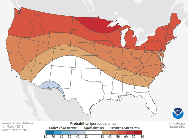 El Niño is expected to affect seasonal climate across the United States during the upcoming months. There are increased chances that Mar-May will be wetter than usual across the southern U.S. and drier than usual over the Midwest and Pacific Northwest. Warmth is favored across the North and West, with cool conditions favored in the south-central U.S.
