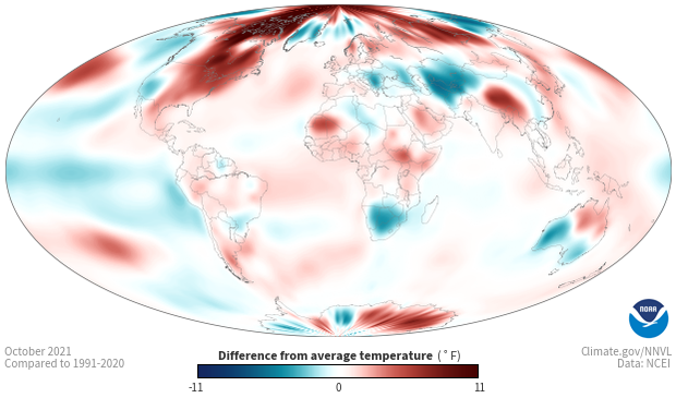 Over time, these data give us a planet-wide picture of how climate varies over months and years and changes over decades. Each month, some areas are cooler than the long-term average and some areas are warmer. Though we don’t see an increase in temperature at every location every month, the long-term trend shows a growing portion of Earth’s surface is warmer than it was during the base period.