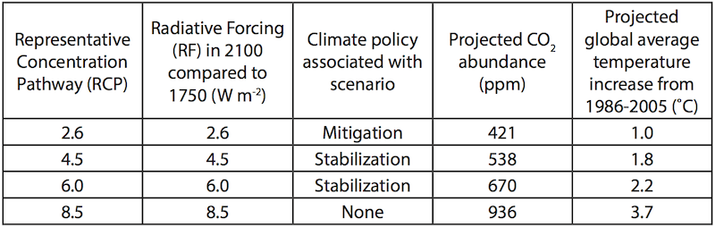 Climate scientists have defined four possible scenarios for the future that they use as consistent inputs for calculating climate in the future. Each scenario is based on a plausible future pathway regarding global emissions of greenhouse gases. The scenarios, known as Representative Concentration Pathways, or RCPs, specify the amount of radiative forcing (RF) in 2100 relative to 1750. For more information about RCPs, see IPCC WGI AR5 Box SPM.1 (final page of the Summary for Policy Makers).