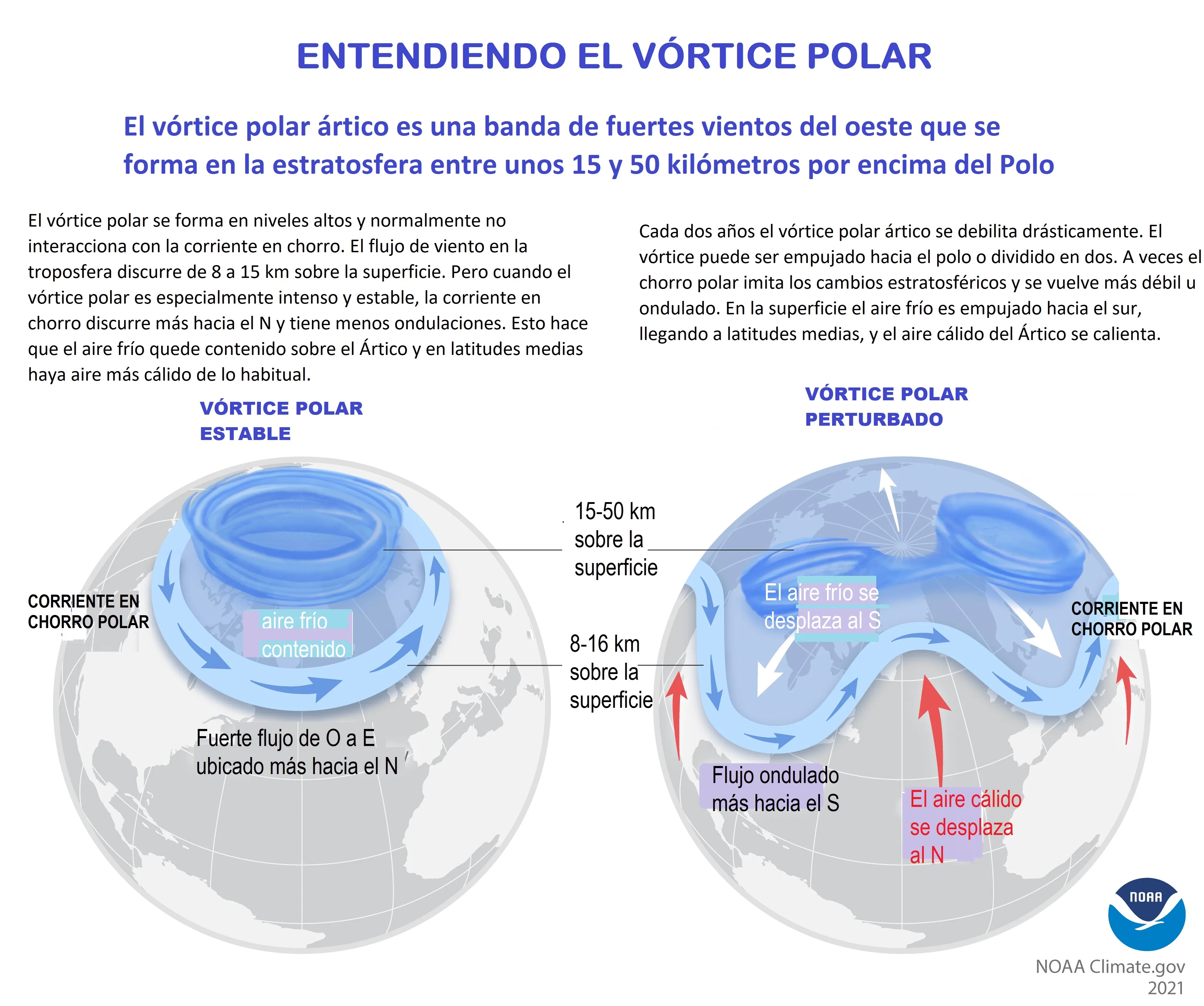 Cuando el vórtice polar ártico es especialmente fuerte y estable (imagen de la izquierda), se favorece que la corriente en chorro polar, la que está por debajo en la troposfera, se desplace hacia el norte. El aire polar más frío permanece en el Ártico. Cuando el vórtice se debilita, se desplaza o se divide (imagen de la derecha), la corriente en chorro polar a menudo se vuelve extremadamente ondulada, permitiendo que el aire cálido inunde el Ártico y que el aire polar se hunda en las latitudes medias. Gráfico de NOAA Climate.gov, adaptado del original de NOAA.gov. De la imagen original se han traducido al castellano de los títulos y se han convertido las unidades de millas a km.