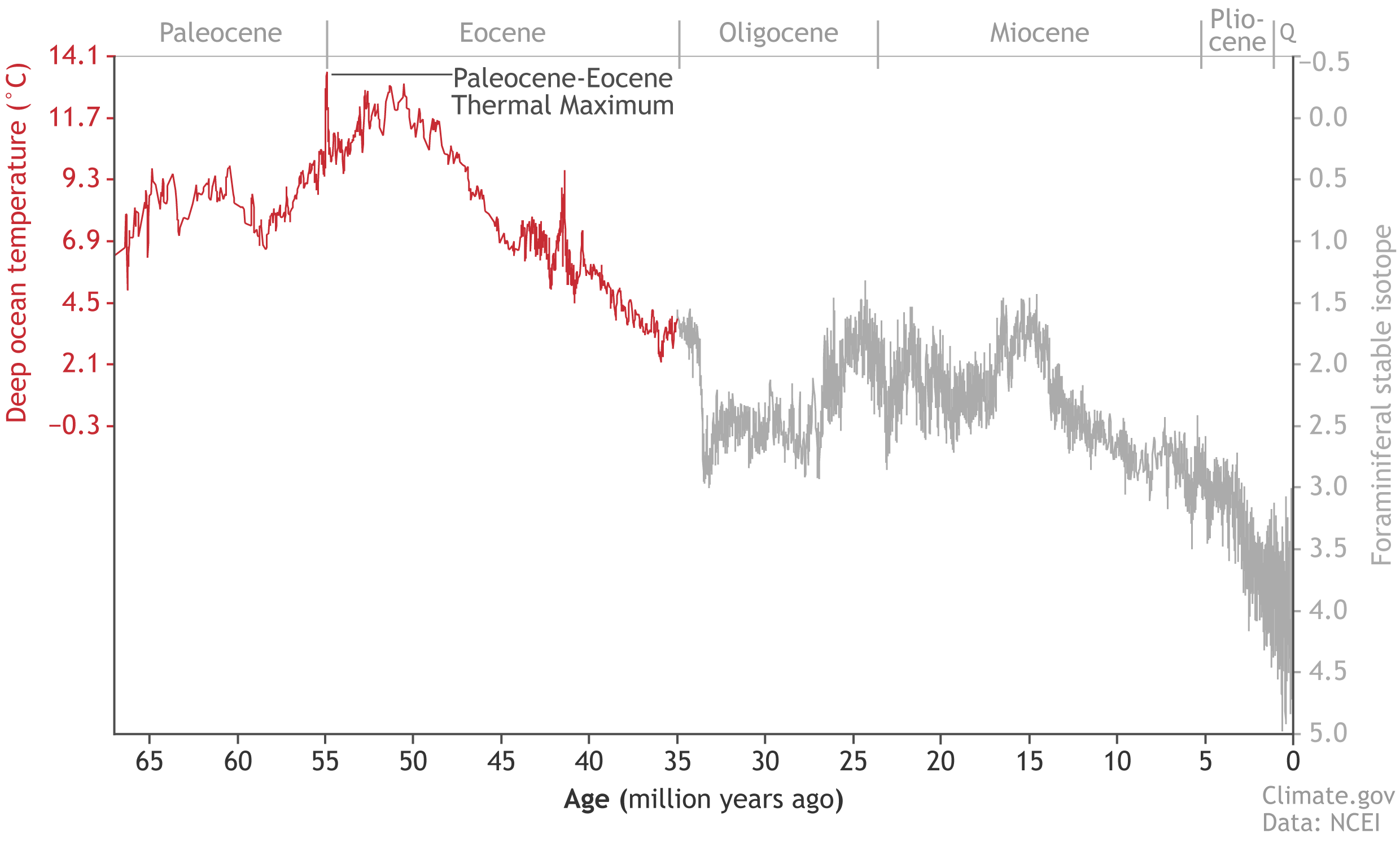 Deep ocean temperatures were generally high throughout the Paleocene and Eocene, with a particularly warm spike at the boundary between the two geological epochs around 56 million years ago. Temperatures in the distant past are inferred from proxies (oxygen isotope ratios from fossil foraminifera). "Q" stands of Quaternary. Graph by Hunter Allen and Michon Scott, using data from the NOAA National Climatic Data Center, courtesy of Carrie Morrill.