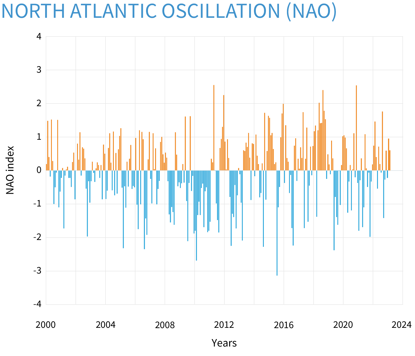 Monthly average of the North Atlantic Oscillation (NAO), which compares the relative strength of semi-permanent high and low pressure patterns in the North Atlantic Ocean. A positive NAO index favors mild winters in the U.S. East. Negative values favor stronger cold-air outbreaks and increased storminess in the eastern U.S. NOAA Climate.gov image, based on data from the Climate Prediction Center.