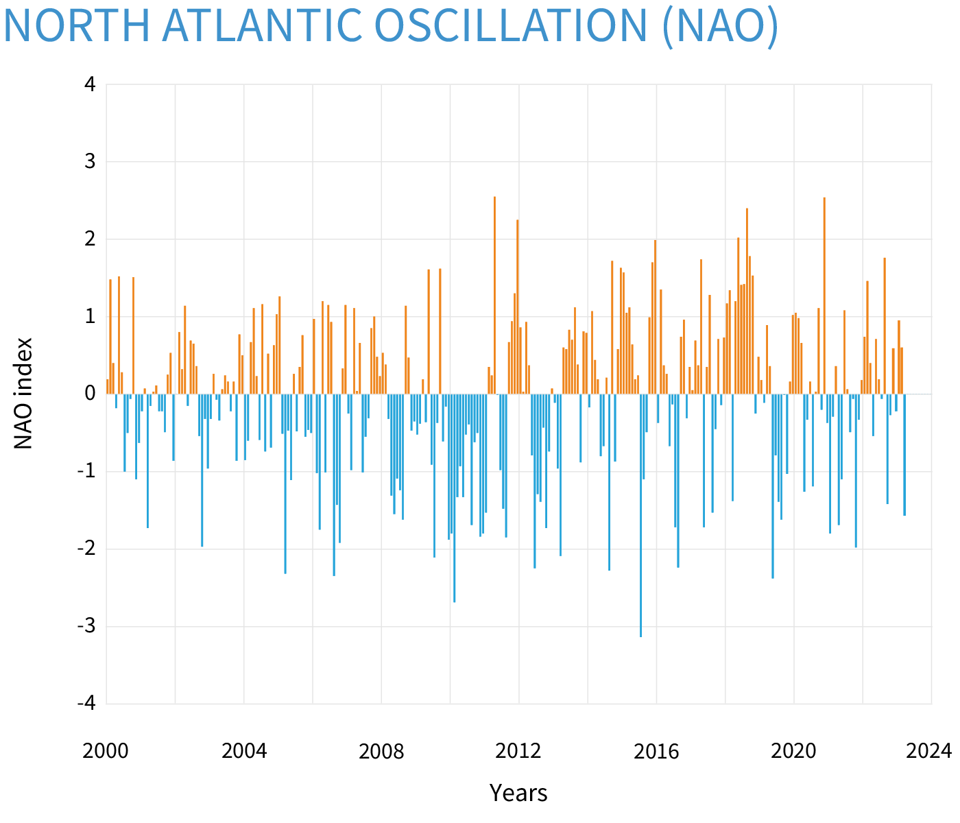 Monthly average of the North Atlantic Oscillation (NAO), which compares the relative strength of semi-permanent high and low pressure patterns in the North Atlantic Ocean. A positive NAO index favors mild winters in the U.S. East. Negative values favor stronger cold-air outbreaks and increased storminess in the eastern U.S. NOAA Climate.gov image, based on data from the Climate Prediction Center.