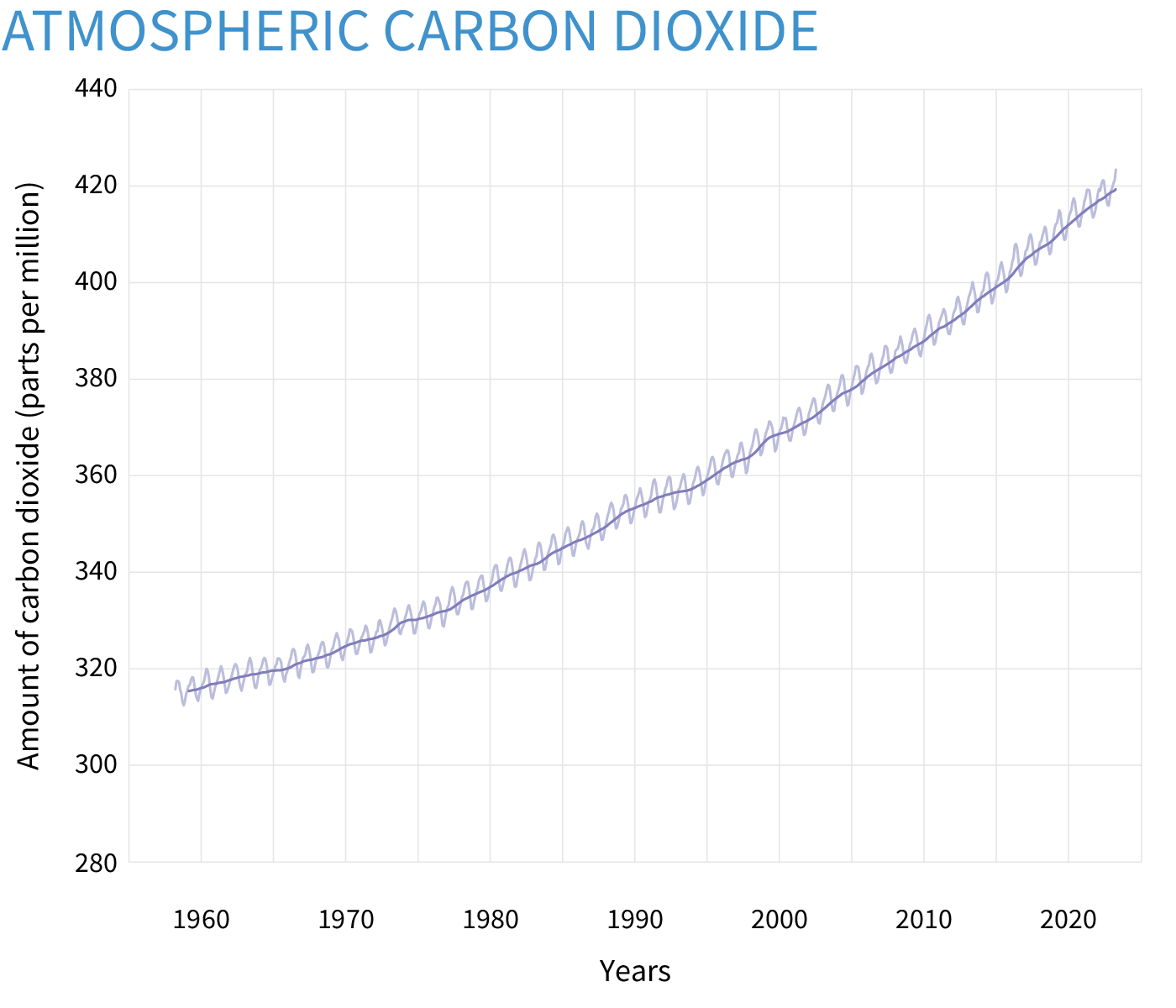 The modern record of atmospheric carbon dioxide levels began with observations recorded at Mauna Loa Observatory in Hawaii. This graph shows the station's monthly average carbon dioxide measurements since 1958 in parts per million (ppm). The seasonal cycle of highs and lows (small peaks and valleys) is driven by summertime growth and winter decay of Northern Hemisphere vegetation. The long-term trend of rising carbon dioxide levels is driven by human activities. NOAA Climate.gov image, based on Mauna Loa monthly mean data from NOAA Global Monitoring Lab.