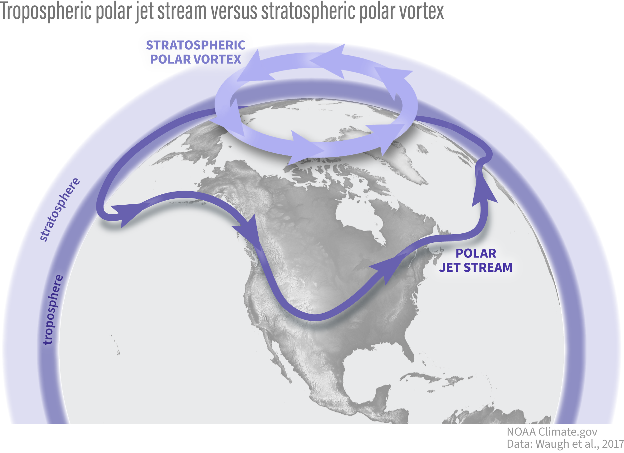 The polar vortex is in the polar stratosphere, above the layer of the atmosphere (the troposphere) where most weather, including the jet stream, occurs. NOAA Climate.gov graphic.