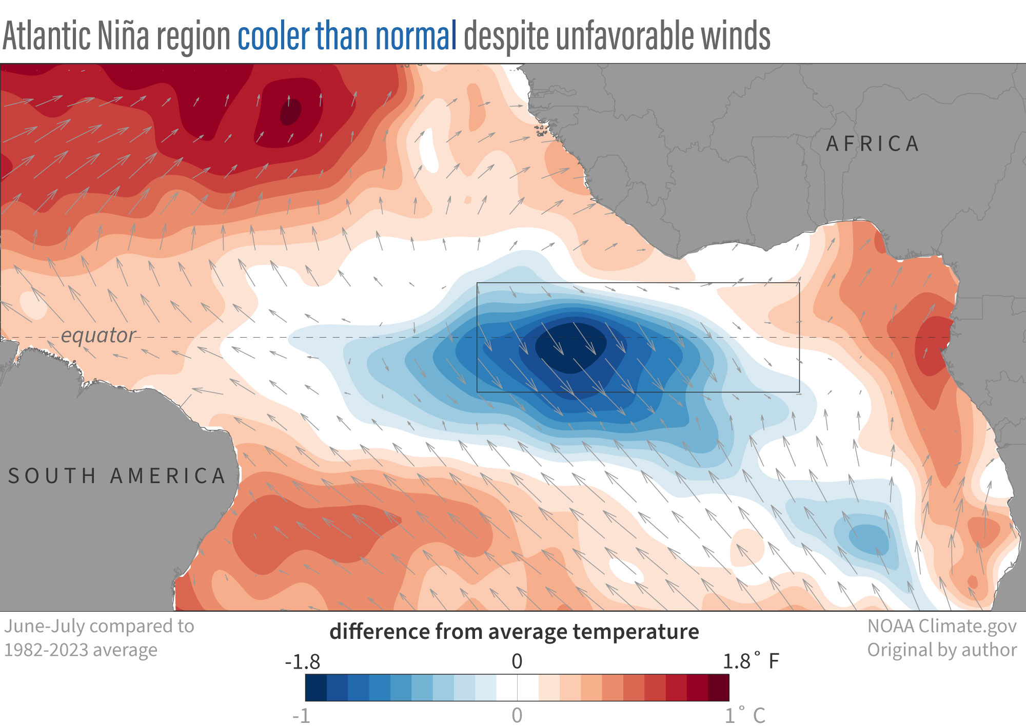 One of the puzzling things about the potential Atlantic Niña event is that the winds have not been especially favorable for upwelling across the key monitoring region (black box). This summer, the area has experienced an unusual northwesterly influence (gray arrows) that has weakened the normal southeasterly trade winds that favor upwelling of cool, deep water at the equator. NOAA Climate.gov image, adapted from original by Franz Philip Tuchen.