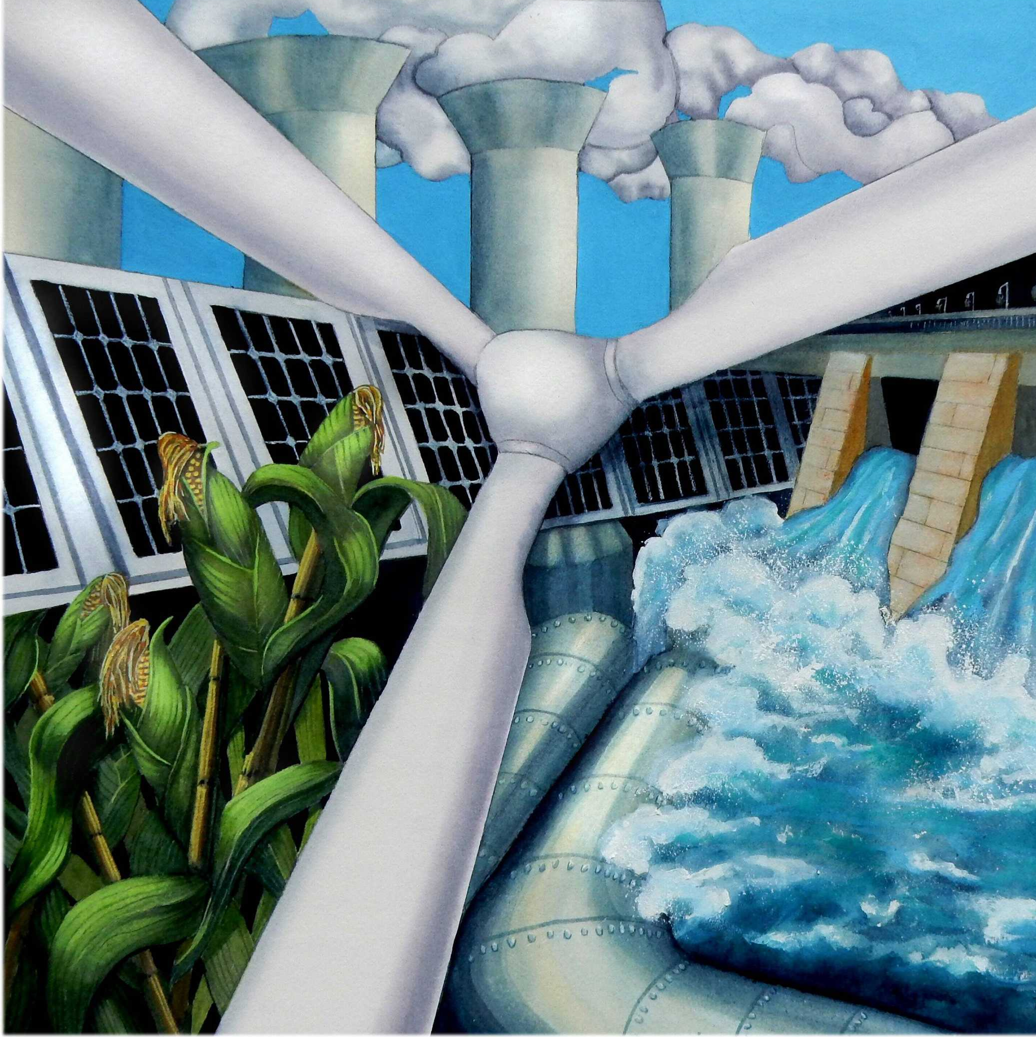 Artist statement: “‘Alternatives’ is an aesthetic interpretation of five viable alternatives to petroleum-based energy: biofuel, wind turbines, geothermal plants, hydroelectric dams, and solar panels. The interconnection of the symbols used for each energy source in the design emphasizes a combined approach to a long-term feasible solution. Environmentally friendly materials used in the creation of this painting include cotton paper and water-based pigments.” Credit: Katharine Cartwright, Art x Climate, Alternatives (2022, watercolor) This art may only be reproduced or re-used in connection with the Fifth National Climate Assessment. Any other use must be negotiated with the author.
