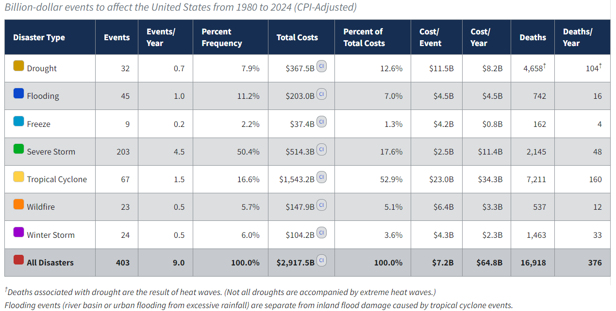 This table shows the breakdown, by hazard type, of the 403 billion-dollar weather and climate disasters assessed since 1980. Severe storms are far and away the most frequent type of billion-dollar disaster. Screenshot from the NOAA NCEI Billion-dollar Disasters webpage.