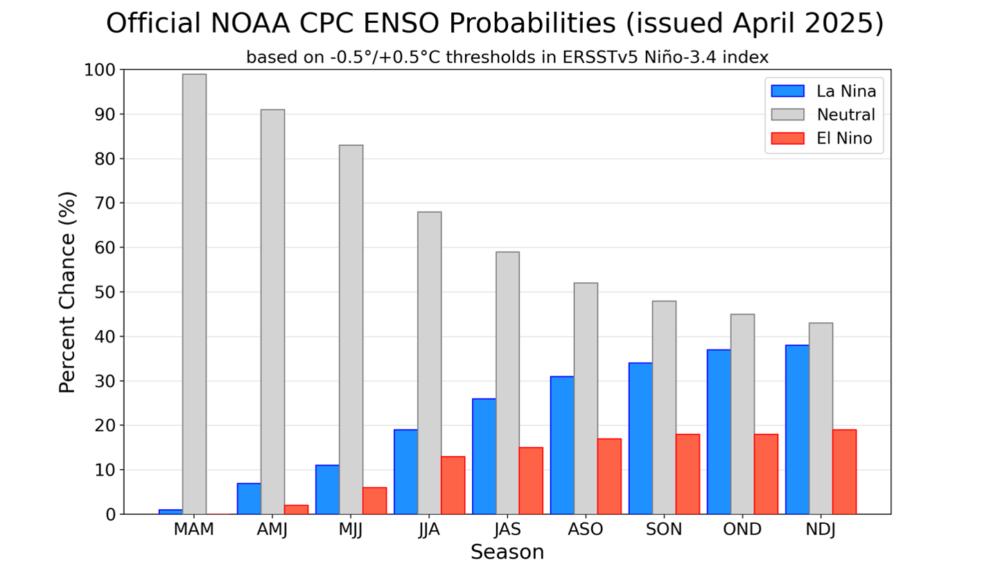 Out of the three climate possibilities—La Niña, El Niño, and neutral—forecasts say that ENSO-neutral conditions (gray bars) are most likely for the Northern Hemisphere spring and summer. Looking out to the fall, neutral is still the most likely, but chances for either La Niña (blue bars) or El Niño (red bars) are increasing. NOAA Climate Prediction Center image.