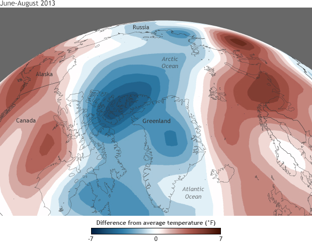 June-August 2013 temperature compared to the 2007- 2012 average. Map by NOAA Climate.gov, based on NCEP Reanalysis data from NOAA ESRL Physical Sciences Division.