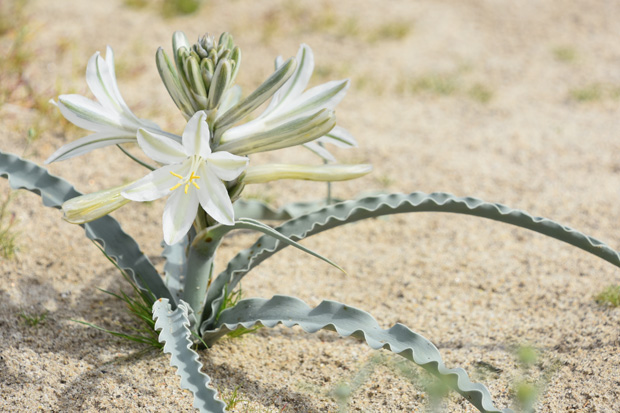 A desert lily blooming in Anza Borrego Desert Park on March 4, 2014. Original photo by Flickr user Rob Bertholf. A color correction has been applied to the original. Used under the terms of a CC license.