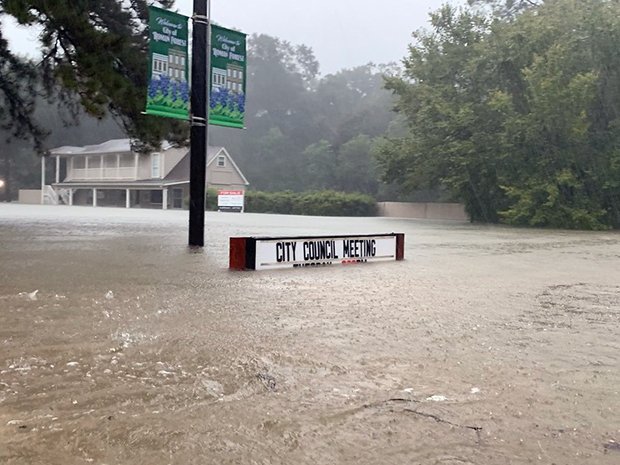Flooding in Roman Forest, Texas, on Sep 19, 2019 from Tropical Storm Imelda. Photo by Jill Carlson, used under Creative Commons license.