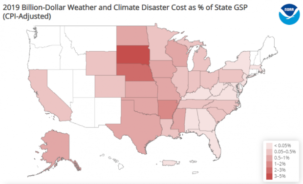 A map of U.S. states shows the costs of billion-dollar disasters in 2019 as a percent of each state's gross state product. Darkest reds show states with highest percent damages, which are found in South Dakota and Nebraska, which suffered from significant flooding in spring and summer 2019. Screenshot from NOAA NCEI Billion-dollar Disaster webpage.