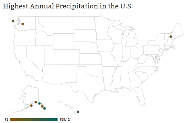 A map of the 10 places in the U.S. with the highest annual precipitation. Map produced with NOAA NCEI U.S. Climate Extremes Tool.
