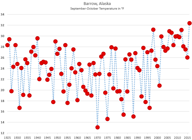 Average temperature for each September-October period since 1925 at Barrow, Alaska. The baseline climate of the 21st century is noticably different than the previous years in the series. Barrow is in northernmost Alaska, and September-October are months when sea ice traditionally formed just offshore.