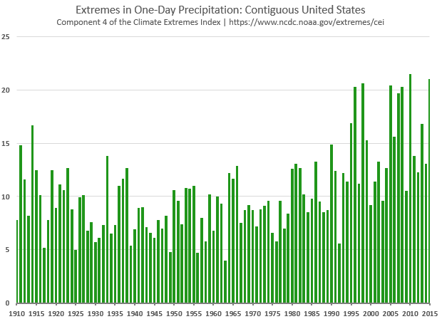 The Climate Extremes Index shows how different climate hazards are changing - or not changing - over time. Its fourth component, shown here, tracks trends in extreme one-day precipitation for each year from 1910 through 2015. The larger the value (the taller the bar), the larger the role that large, one-day precipitation events played in the year's rainfall budget. The data indicate that the nation, on average is seeing one-day big rain events increase over time, with inter-annual ("year to year") variability.
