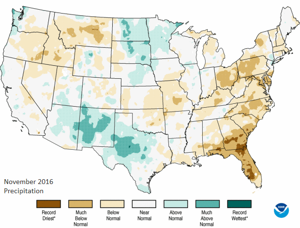 November 2016 precipitation percentile maps for the contiguous United States. The colors show how the November 2016 precipitation compared to history for each location. Near Normal: precipitation was in the middle one-third of history. Above or Below Normal: precipitation was in the upper or lower one-third of history, respectively. Much Above or Much Below refers to the upper or lower 10 percent of history. Record driest and wettest indicate unprecendented November precipitation values at that location.