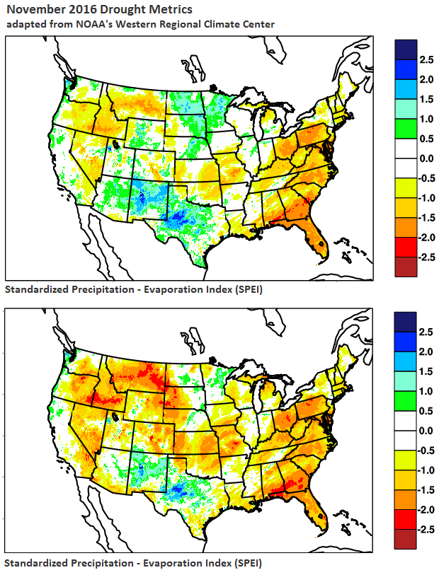 Comparing two drought indices for November 2016 shows the role of warmth in exacerbating dry conditions. The top panel shows the Standardized Precipitation Index (SPI), which depicts drought severity according to the precipitation that occurred during the month. The bottom panel shows the Standardized Precipitation Evapotranspiration Index (SPEI), which depicts drought severity according to the precipitation that occurred during the month (supply), combined with the evaporative stresses (demand) based on temperature. The SPI and SPEI technically depict severity in terms of unusualness. Increasingly positive values (building to darker blues) indicate more unusual wetness, while increasingly negative values (building to darker reds) indicate more unusual dryness/drought. These maps were adapted from those produced by NOAA's Western Regional Climate Center, using PRISM data.