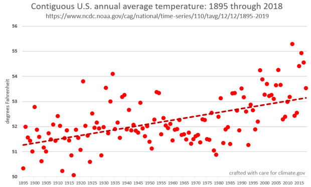The average annual temperature for the contiguous United States, from 1895-2019. Each circle represents the nation's average temperature for a year. The red dashed line represents an ordinary least-squares regression ("line of best fit") through the data, and implies a warming trend of approximately 1.5 degrees Fahrenheit per century for the period.