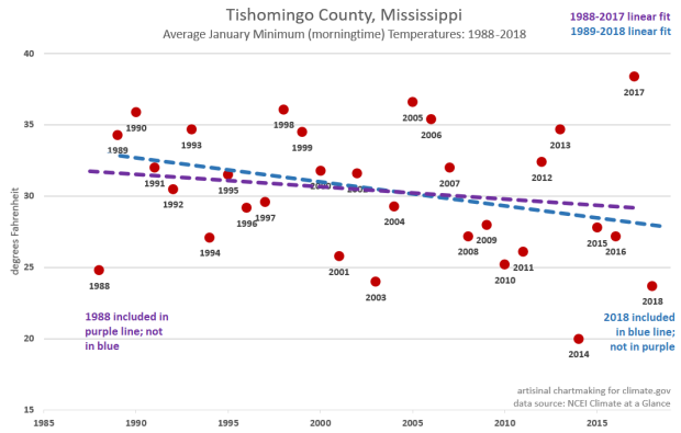 What happened to make such a dramatic difference as that 30-year window slid just one year to the right? For starters, there is a legitimate underlying trend that both windows picked up. January mornings have trended colder in Tishomingo County over the past three decades.