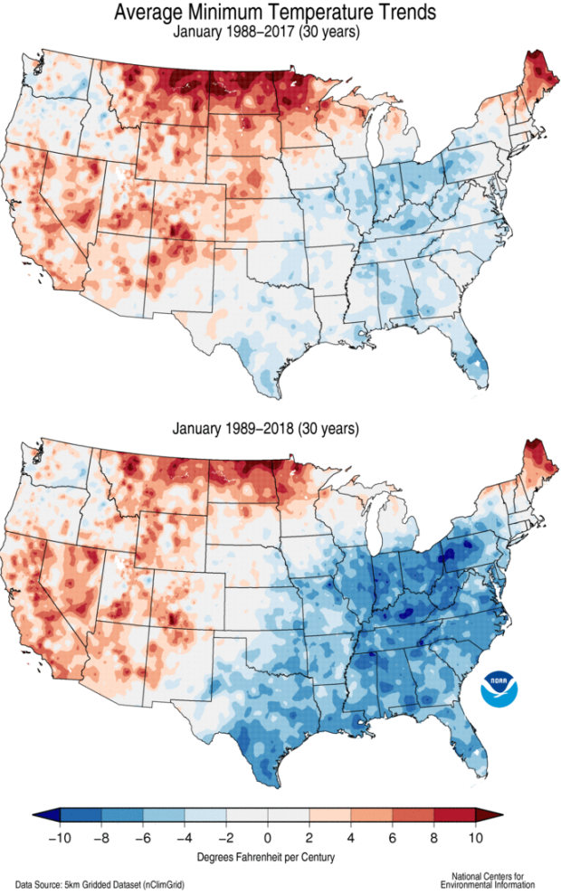 Two maps of 30-year trends in average January minimum temperatures (the average of the month's morningtime temperatures) for two closely overlapping 30-year periods. 1988-2017 (top) and 1989-2018 (bottom).