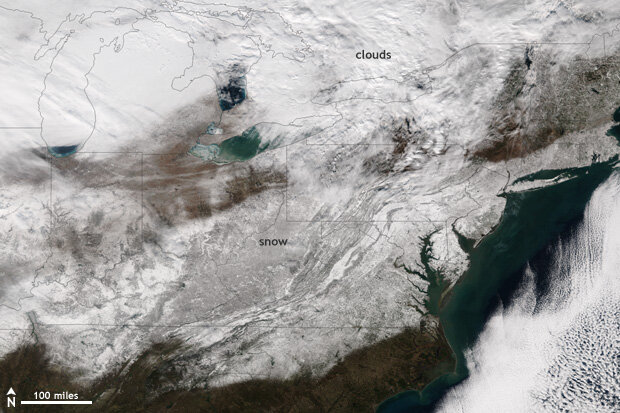 A major snow storm left a trail of white across the Ohio Valley and Mid-Atlantic states in January 2016. NASA/NOAA Suomi-NPP satellite image from NOAA Environmental Visualization Lab.