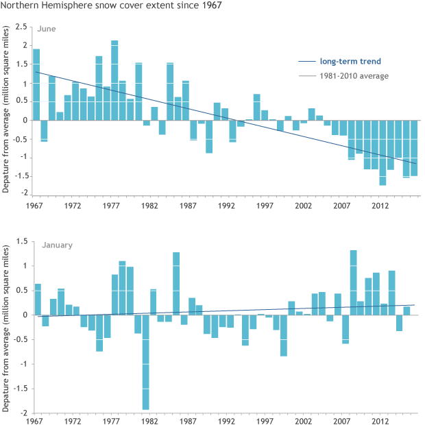 The largest changes in snow cover—big declines—are occurring during the warmer months of the year and during the transition seasons. There has been a slight upward (more snow cover) trend in hemisphere-wide snow cover during the winter months, but that doesn’t mean all places have seen an increase in snow cover during the winter months. To get a get a better of idea of how winter snow cover is changing versus summer snow cover we can compare snow conditions in January to those in June.