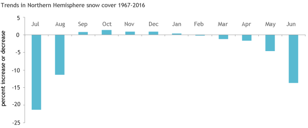 For June, the Northern Hemisphere snow cover extent is decreasing at a rate of 13.5 percent (about 490,000 square miles) per decade. July is losing snow cover at an even faster rate: 21.3 percent (301,000 square miles) per decade, the highest decline rate among all months.
