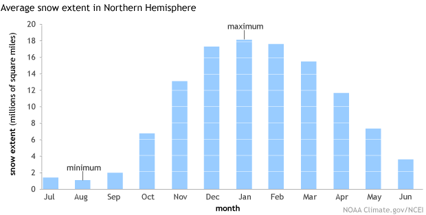 As you’d expect, Northern Hemisphere snow cover extent typically reaches an annual minimum during late summer and the highest extent in midwinter. One of the reasons the snow season starts on July 1st is that it nearly coincides with the annual minimum in snow cover in the Northern Hemisphere, and allows us to capture annual snowfall without having to split the winter season.