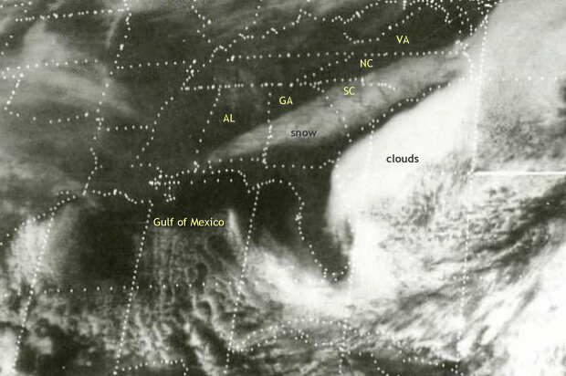 Early snow cover mapping depended on people to interpret paper printouts of satellite images such as this one from February 11, 1973. Today, computers analyze digital images and identify snow-covered areas using rules developed by scientists. This image is one frame of an animated gif of a major snowstorm in the U.S. Southeast created by the Wilmington, NC, NWS office, based on scanned hardcopies provided by The Schwerdtfeger Library at The Space Science and Engineering Center (SSEC).