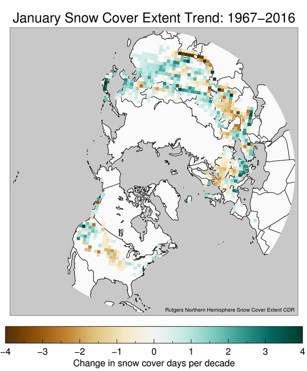 Across the entire Northern Hemisphere, average January snow cover extent is increasing at a rate of 0.3 percent (or about 58,000 square miles) per decade, which in statistical terms is not significant. When it comes to the number of days with snow on the ground, there has been a decrease across parts of the central United States, northern Europe, western Asia, and the Himalayas. But the number of snow covered days has increased in western North America, southern Europe, and central and eastern Asia.