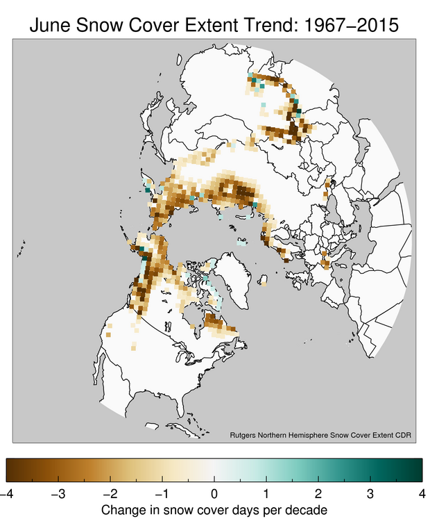 For most locations that typically have snow on the ground during June, the number of days with snow on the ground is also decreasing rapidly, particularly across the high elevations of western North America, Siberia, and the Himalayas. The dropping snow cover during June represents an earlier melting of snow which has many implications for pests, wildfires, and water resource management.