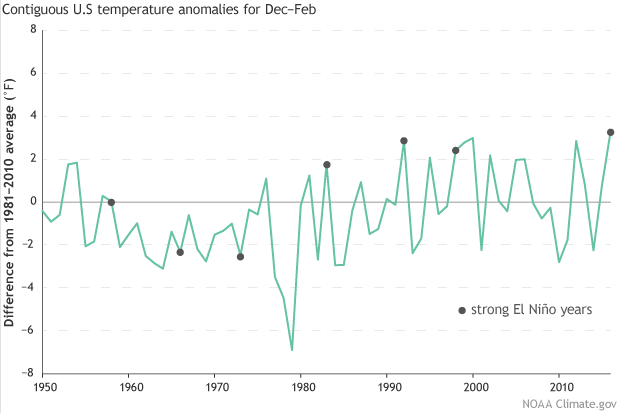 December-February temperature in the contiguous U.S. compared to the 1981-2010 average for each winter since 1950, with strong El Niño years marked with gray dots. Earlier El Niño winters were near or below-average, while the four most recent events saw warmer-than-average temperatures. NOAA Climate.gov graph, based on analysis by Jake Crouch, NCEI.