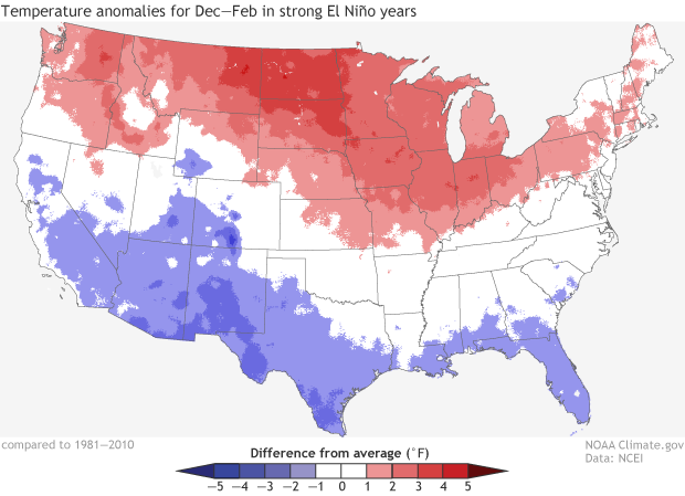 Winter temperatures (December-February) compared to the 1981-2010 average during the 6 strongest El Niño events since 1950 (not including the ongoing event). Based on these 6 events, strong El Niño winters are warmer than average across the northern U.S. and cooler than average across the southern U.S. NOAA Climate.gov map based on analysis by Jake Crouch, NCEI.