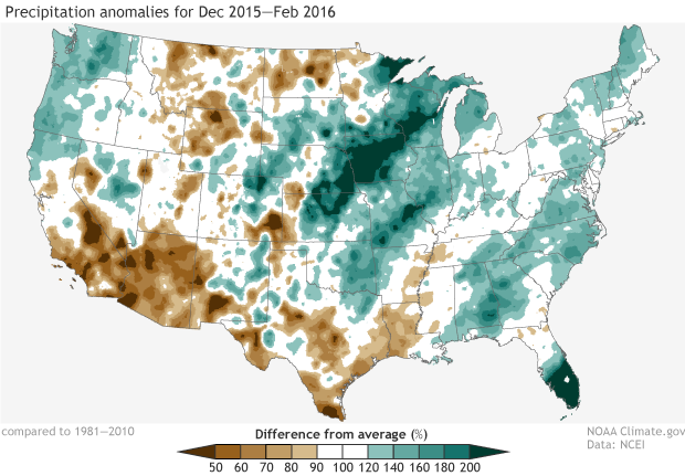 December 2015-February 2016 precipitation compared to the 1981-2010 average. It was wetter than average in the Pacific Northwest and part of the Gulf Coast, and much wetter than average in the Great Plains and southern Florida. NOAA Climate.gov map based on analysis by Jake Crouch, NCEI.