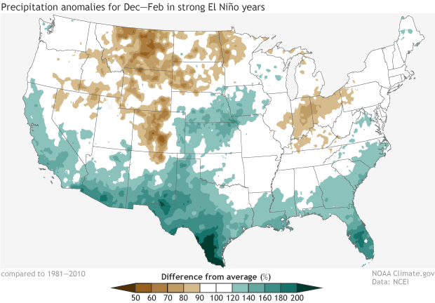 Winter precipitation (December-February) compared to the 1981-2010 average during the 6 strongest El Niño events since 1950 (not including the ongoing event). Based on these 6 events, strong El Niño winters are wetter than average across the southern U.S. and drier than average in the Northern Plains, the Northern and Southern Rockies, and the Ohio Valley. NOAA Climate.gov map based on analysis by Jake Crouch, NCEI.