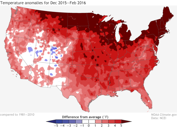 Winter temperatures (December 2015-February 2016) compared to the 1981-2010 average. It was the contiguous U.S.' warmest winter on record. NOAA Climate.gov map based on analysis by Jake Crouch, NCEI.