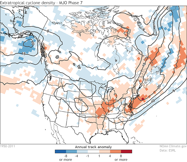 Number of low-pressure systems passing within ~500 miles (750 km) of each point during all MJOs in Phase 7 from 1950–2011. Red and blue shading show how many more storms passed through each point in Phase 7 compared to the average for all eight phases. NOAA Climate.gov image adapted from original by Carl Schreck.