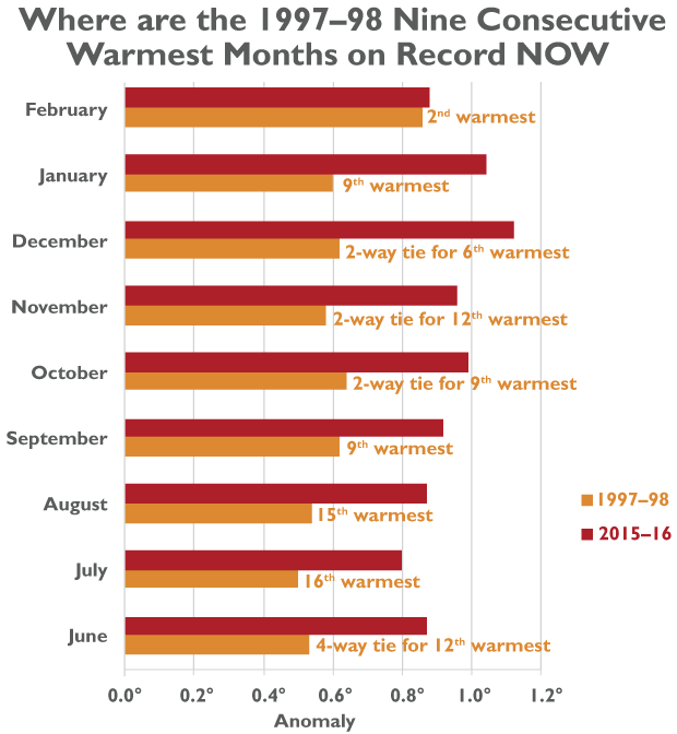 As of the end of January, we’d seen nine straight “warmest months” – each month from May 2015 through January 2016 was the warmest on record for that month. This streak matches a nine-month run from June 1997 through February 1998.