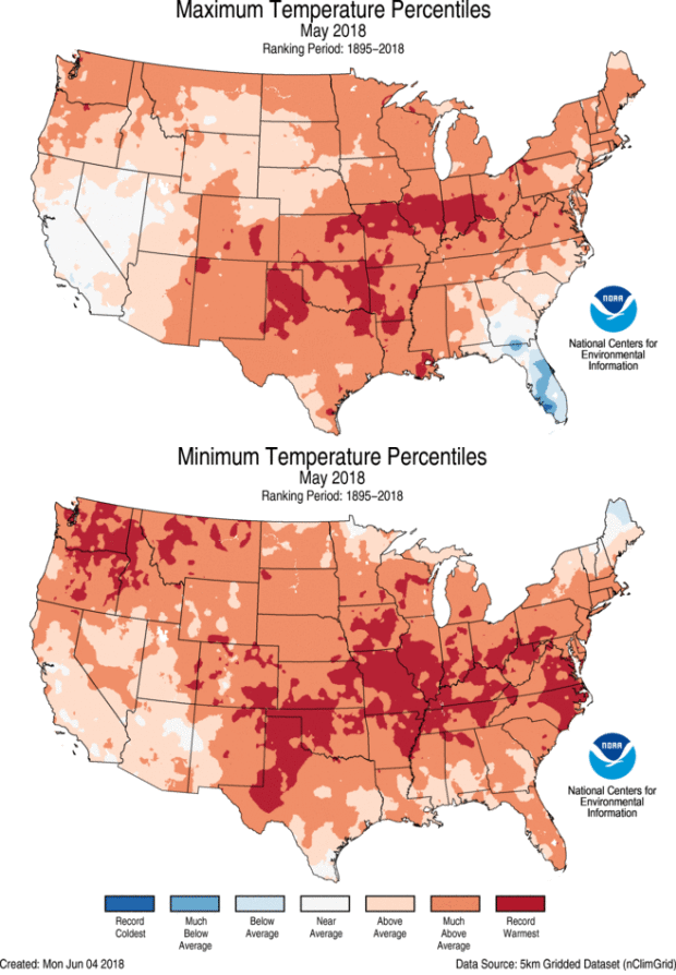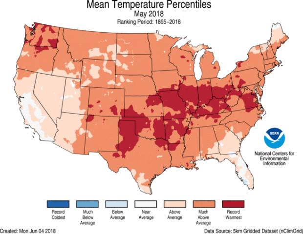 On June 6th, the National Centers for Environmental Information released the U.S. climate data for May and Spring (March through May) 2018. People and businesses use this information at the granular level to help gauge crop progress or understand sales outcomes or predict HVAC bills. But the national big picture takeaway was clear: this was the warmest May on record for the United States.