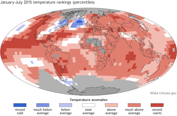 Much of the globe was record warm (darkest red) from January-July 2015, setting the stage for a new warmest year on record. Map by NOAA Climate.gov, based on NCEI data.