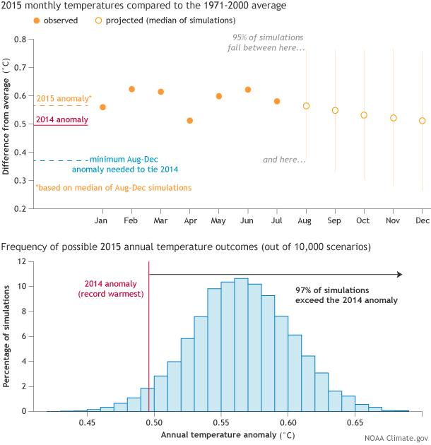 (top) Observed monthly temperature anomalies for January-July 2015 (solid dots) and projected August-December values (open dots show the median; 95% of the simulated values range along the vertical bars). Using the simulated medians, the 2015 anomaly (orange line) will easily top 2014 (red line). The August-December anomaly could drop below 0.4°C (blue dashed line), and 2015 would still tie for the warmest year on record. (bottom) Out of 10,000 plausible annual outcomes, only a few percent result in 2015 losing its lead over 2014.