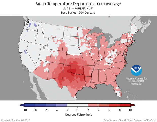 Temperature for June-August 2011 compared to the twentieth-century average. The Southern Plains and Gulf Coast were much hotter than average (red). The spring wetness in the Ohio Valley probably helped keep the temperatures in the Ohio Valley closer to normal (white). NOAA NCEI map by Deke Arndt.