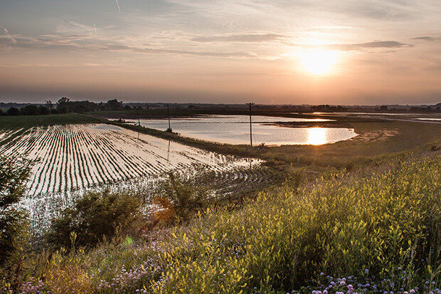 The Sun shines down on a flooded cornfield near Orrick, Missouri, on June 6, 2015. When the ground is wet from spring rains, the summer Sun has to evaporate the water before the ground really srtarts to heat up. Photo by Vincent Parsons, via Flickr. Used under a CC license.
