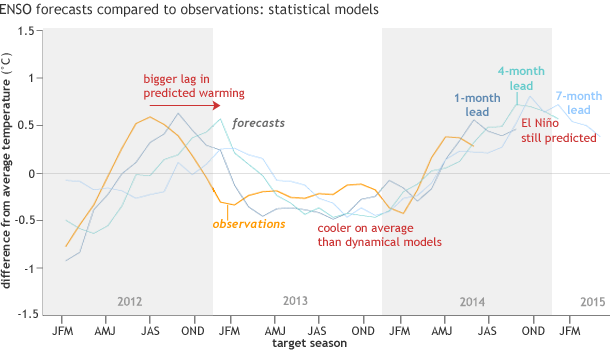 During summer to fall 2013, the model predictions were approximately on target. However, the models missed the brief period of cooler Niño3.4 index values during winter 2013-14 (never reaching a full-blown La Niña).
