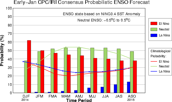 These forecasts extend out to ten months into the future. For example, this month’s first forecast period is for the December-January-February average, and the last is for August-September-October 2015. These probabilities are what go into the consensus probabilistic forecast (fig. 1).